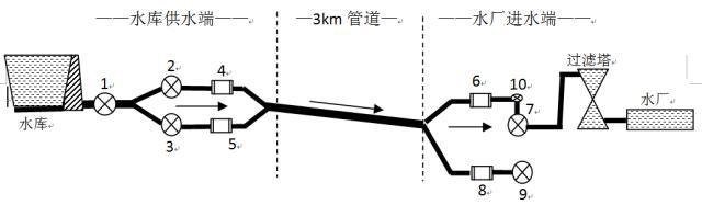 2 、 圖(tu)中 1 号閥門和 2 、 3 号閥(fá)門相距 20m 左右; 2 号閥(fa)門和 4 号電磁流量(liang)計相距 15m 左右, 3 号閥(fa)門和 5 号電磁流量(liàng)計也相距 15m 左右; 6 号(hao)電磁流量計和 7 号(hào)閥門相距 20m 左右,中(zhōng)間有個水平 90° 的直(zhi)角彎, 7 号閥門後面(mian)是高約 8m 的過濾塔(ta); 9 号閥門爲水廠備(bèi)用管道,爲常閉狀(zhuàng)态;